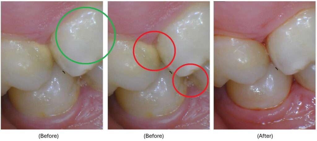 (In the image above, you can see that the patient is brushing their teeth well—the surfaces highlighted in the green circle are clean and bright. However, neglecting the areas between the teeth leads to problems. In the red circle, you can see where plaque and calculus (tartar) have built up because those gaps weren’t cleaned.)