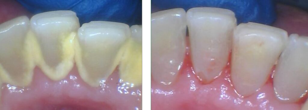 (In the left photo, you can clearly see the yellow dental calculus (tartar) buildup along the gum line. The photo on the right shows the immediate difference after a professional cleaning. At Finesse Dentistry in Boston, we always provide ‘before and after’ pictures so our patients can see the healthy results for themselves.)