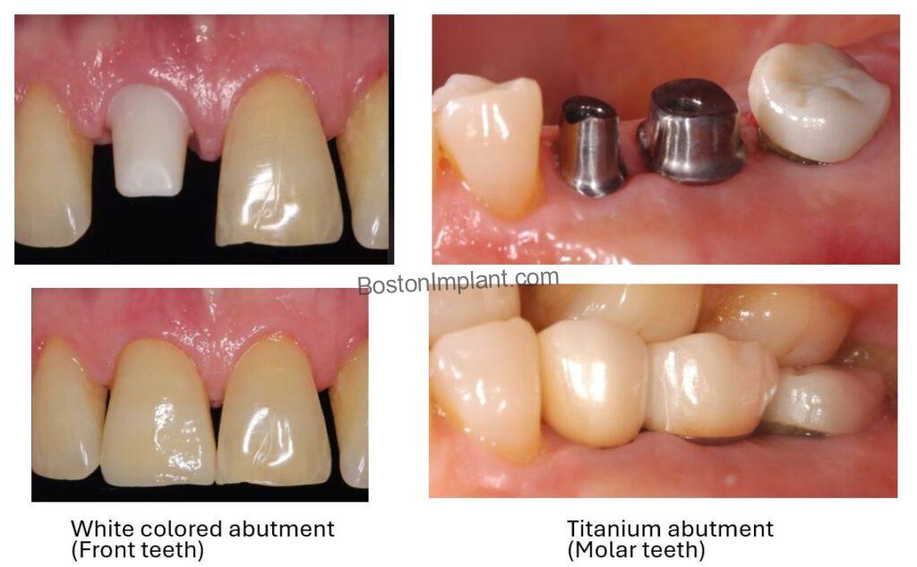 As you can see in the images below, we prioritize aesthetics in the front by utilizing tooth-colored connectors (abutments). This helps the implant seamlessly blend with your natural teeth. For the molar teeth, where durability and long-term function are paramount, we use robust titanium connectors (abutments). This ensures the implant can withstand the forces of chewing for years to come.